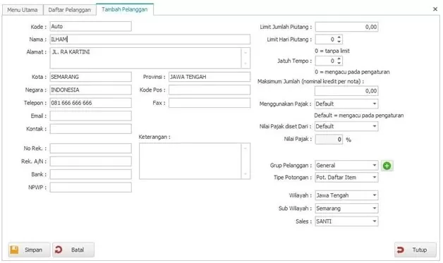 - Wilayah : Menentukan wilayah dari Pelanggan, hubungannya nanti dengan laporan penjualan per wilayah. Dapat dikosongkan jika tidak diperlukan.