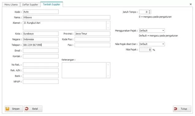 - Mulai masukkan informasi data Supplier dari Kode Supplier, Nama, Alamat dan seterusnya, Untuk Kode Supplier “Auto” akan otomatis dibuatkan setelah simpan. Kode Supplier bisa diubah sesuai kebutuhan.