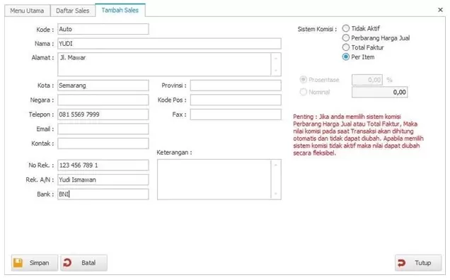- Masukkan informasi seperti kode Sales, nama, alamat, dan lainnya. Untuk Kode Sales “Auto”, kode akan dibuat otomatis setelah data disimpan, namun bisa diubah sesuai kebutuhan.