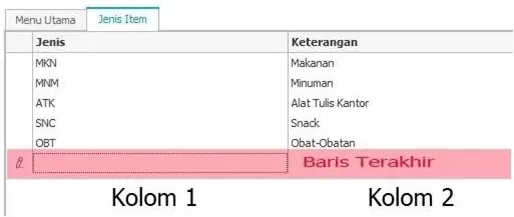 - Pada kolom kedua ketik keterangan dari Jenis/Satuan/Merek tersebut, tekan enter.