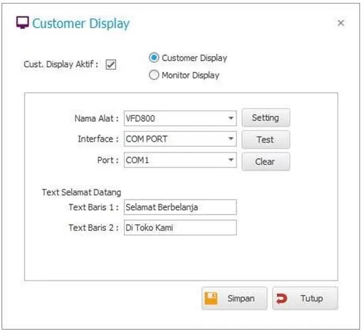 3. Akan tampil form pengaturan Customer Display.