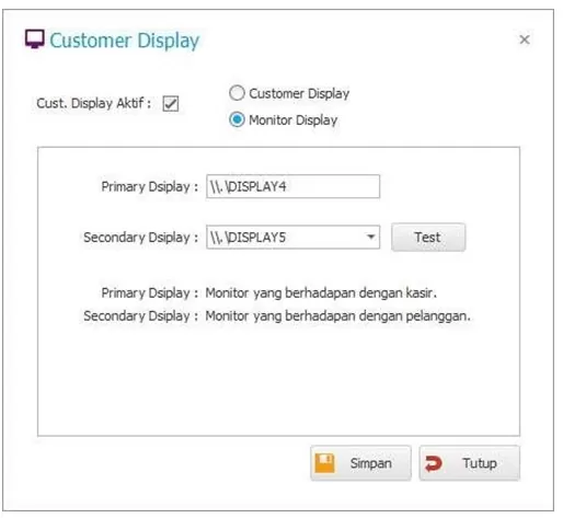 - Pada Pengaturan Customer Display pilih : Monitor Display