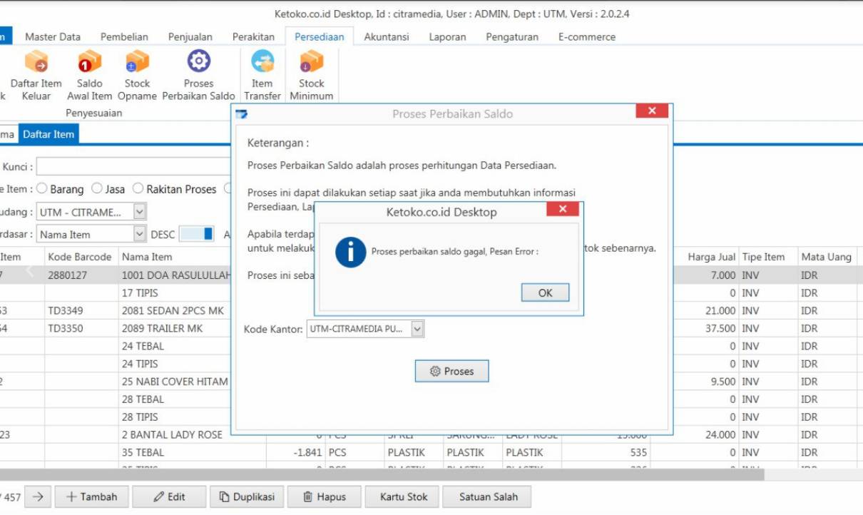 A : Penyebab stok tidak sesuai belum kami temukan, untuk error saat melakukan proses perbaikan saldo disebabkan karena transaksi sudah sangat banyak dan program tidak bisa memprosesnya, Untuk memperbaikinya harus melakukan kosongkan data pindah saldo karena fitur perbaikan saldo tidak bisa digunakan.