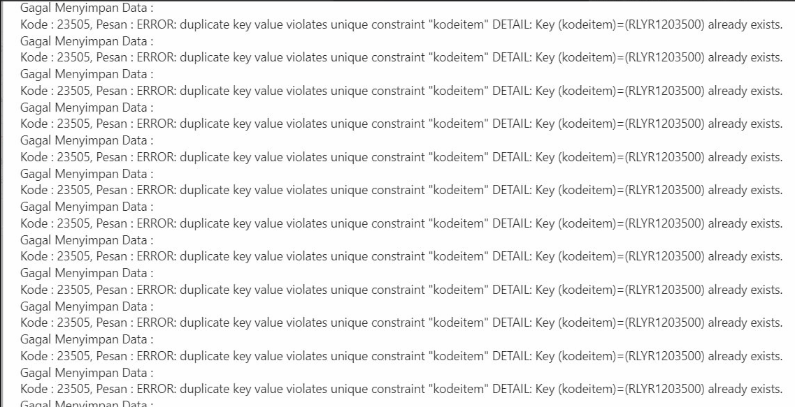 Q : Saya mengalami kendala eror duplicate key saat import data item satuan, kami cek di daftar itemnya belum ada item tersebut dan ada keterangan gagal koneksi.