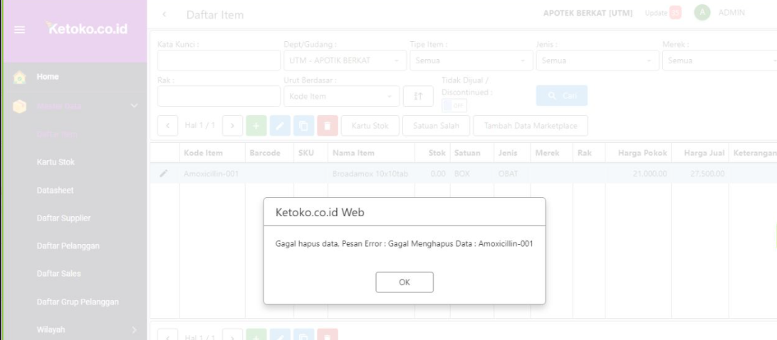 Q : Kenapa saat hapus item yang belum ada transaksi tidak bisa
