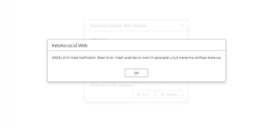 Q : Mohon info menganai share WA faktur melalui Website ketoko.co.id apakah ada settingan tertentu? Karena ketika klik share dan memasukan nomor tampil keterangan seperti gambar berikut