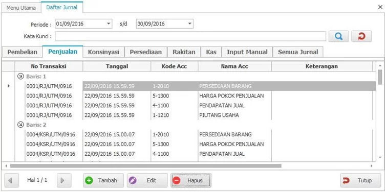 • Kelompok Jurnal : Tampilan daftar jurnal dibagi menjadi beberapa Kelompok Tab Jurnal seperti Pembelian, Penjualan, Konsinyasi, Persediaan, Rakitan, Kas, Input Manual, Semua Jurnal