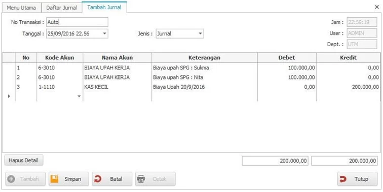 2. Kemudian Klik tombol ” Tambah ” untuk mencatat jurnal baru,