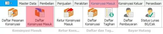 Konsinyasi Masuk berfungsi untuk mencatat aktivitas konsinyasi item/barang masuk dari supplier, Pada proses ini stok item akan bertambah.