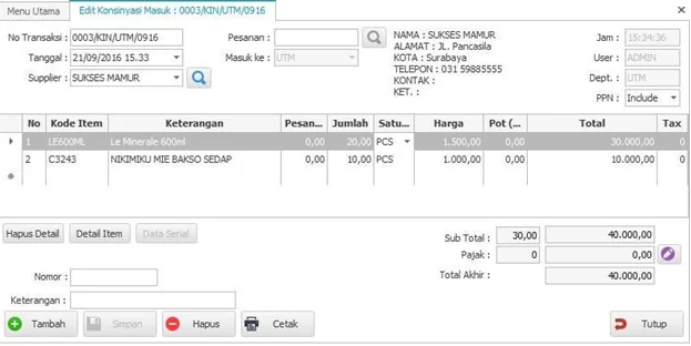 - Mulai masukkan informasi data konsinyasi Tanggal, Supplier, Masuk ke Dept/Gudang?,