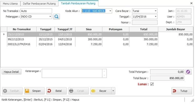 Fungsi lain daftar pembayaran adalah untuk menampilkan, menambah, mengubah dan menghapus transaksi pembayaran piutang.