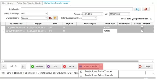 Transfer Item yang sudah di export akan berubah statusnya menjadi “Sudah Transfer”, apabila diperlukan untuk revisi transaksi transfer maka masih bisa diubah statusnya.
