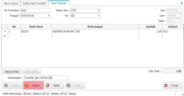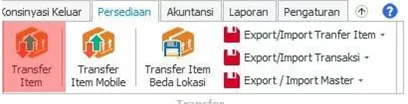 Transfer item berfungsi untuk memindahkan item dari salah satu departemen ke departemen lainnya dalam satu lokasi yang sama. sebagai contoh memindahkan barang dari gudang ke toko.