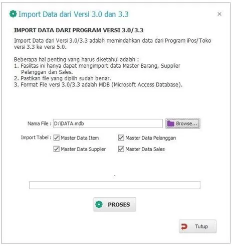 Import Dari Program Toko iPos 3.X berfungsi untuk memindahkan data Item, Supplier, Pelanggan dan Sales ke Program Toko versi 5.0,