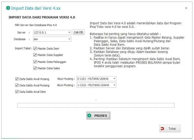 Import Dari Program Toko iPos 4.0 berfungsi untuk memindahkan data Item, Supplier, Pelanggan dan Sales ke Program Toko versi 5.0,
