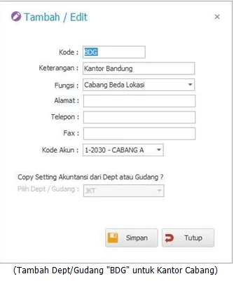 - Mengubah/Mengisi kode akun untuk kantor cabang, dengan cara masuk ke Menu Master Data, pilih Dept/Gudang,