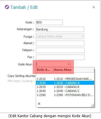 - Kode Akun pilih kode akuntasi untuk Akun persediaan Cabang BDG,
