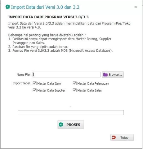 Pada program ini anda juga dapat melakukan import data dari Program Toko versi iPos 3.0 dan 3.3, data yang bisa di import hanya data Barang, Suplier, Pelanggan dan Sales.