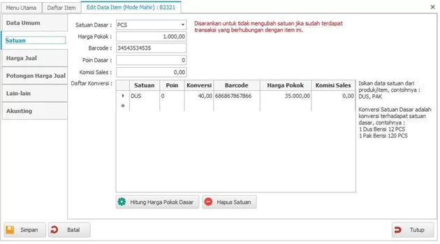 Penting : Disarankan untuk tidak mengubah satuan jika sudah input saldo awal, transaksi baik penjulan, pembelian, dll.