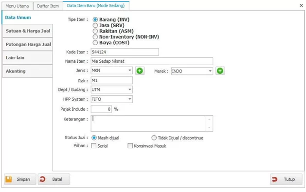 2. Mulai masukkan informasi data Item dari Tipe Item, Kode Item, Nama, Jenis dan seterusnya,