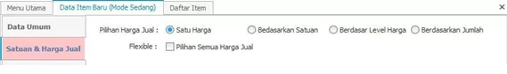 Pada Tab Satuan dan Harga Jual terdiri dari Opsi pilihan Harga yaitu : Satu Harga, Satuan, Level Harga dan Berdasarkan Jumlah, detail keterangan dibawah ini.