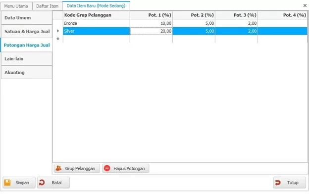 - Potongan harga jual tidak harus diisi, terkecuali memang dibutuhkan,