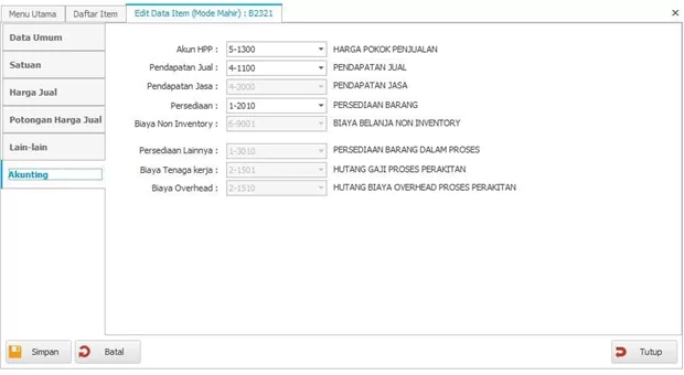 - Non Inventory : Item yang tidak dimasukan nilainya sebagai inventory. Contoh : Peralatan Kantor, dll.
