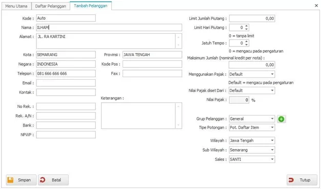 2. Mulai masukkan informasi data Pelanggan dari Kode Pelanggan, Nama, Alamat dan seterusnya, Untuk Kode Pelanggan “Auto” akan otomatis dibuatkan setelah simpan. Kode Pelanggan bisa diubah sesuai kebutuhan.