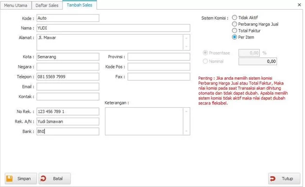 - Mulai masukkan informasi data Sales dari Kode Sales, Nama, Alamat dan seterusnya, Untuk Kode Sales “Auto” akan otomatis dibuatkan setelah simpan. Kode Sales bisa diubah sesuai kebutuhan.