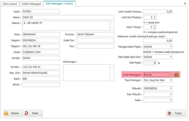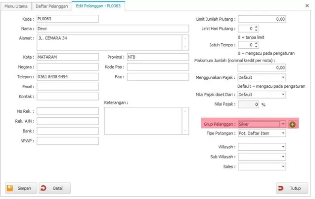2. Kedua : Edit masing-masing pelanggan yang akan mendapatkan spesial harga untuk dimasukan ke dalam grup yang telah dibuat.