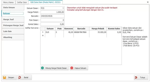 1. Tambah / Edit salah satu item. Pastikan Satuan dan Konversi satuan sudah diisi, pada Tab Satuan, seperti pada gambar dibawah :