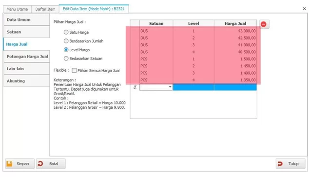 2. Pada Tab Harga Jual Pilihlah opsi “Berdasarkan Level”. Pada daftar isikan Satuan, Level, dan Harga Jual, seperti pada gambar berikut :