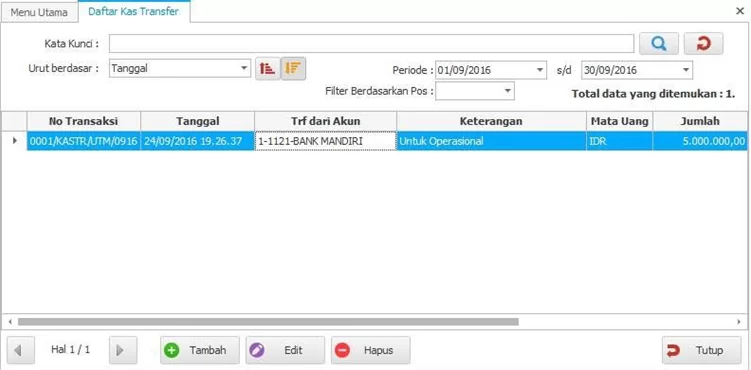- Akan tampil daftar kas transfer, untuk informasi detail tentang cara penggunaan dan fungsi dari daftar transaksi klik disini.