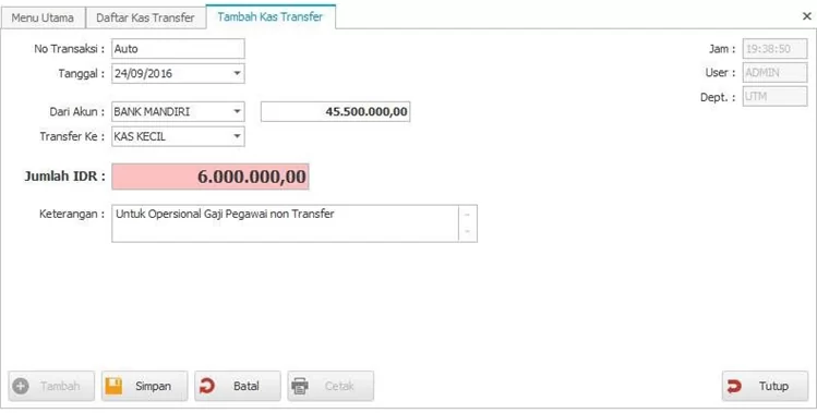 - Klik tombol ” Tambah ” untuk menambah data kas transfer,