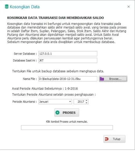 Kosongkan data dan Pindahkan Saldo berfungsi untuk menghapus semua data tansaksi dan memindahkan saldo akhir menjadi saldo awal pada periode berikutnya yang dipilih. Proses ini akan menyisakan data Master Item, Suplier, Pelanggan, Sales dan Stok. Saldo akhir dari Hutang Piutang dan Proses akuntansi akan dipindahkan ke saldo awal periode berikutnya.