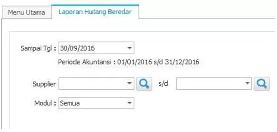 - Modul : Filter untuk menampilkan hutang modul pembelian dan konsinyasi masuk atau salah satu.