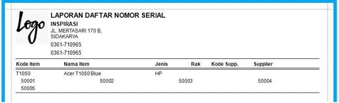 Laporan ini berfungsi untuk menampilkan / mencetak Daftar Item beserta nomor serialnya. Daftar Item yang tampil ini adalah daftar item yang menggunakan Opsi Pilihan “Serial”, pengaturan serial ini ada pada menu Master data->Daftar Item->Tambah/Edit->Pilihan = Serial (Centang)