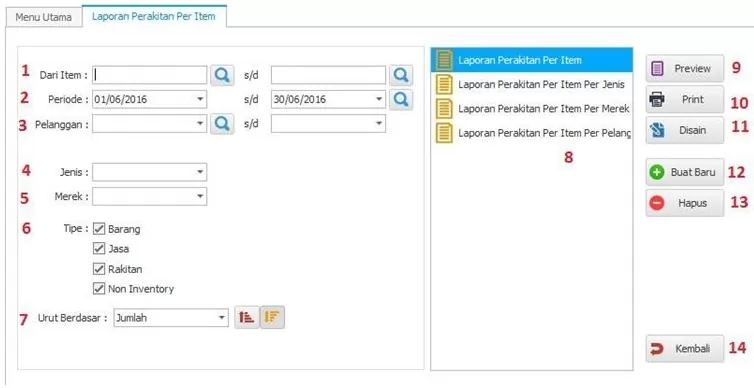 - Filter berdasarkan kode item, kosongkan filter bila ingin menampilkan semua data kode item.