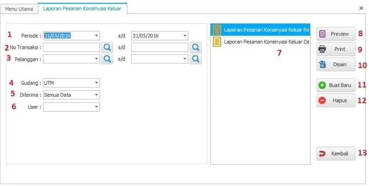 Laporan ini berfungsi untuk menampilkan / mencetak transaksi pesanan konsinyasi keluar yang pernah dicatat pada program dalam bentuk laporan.
