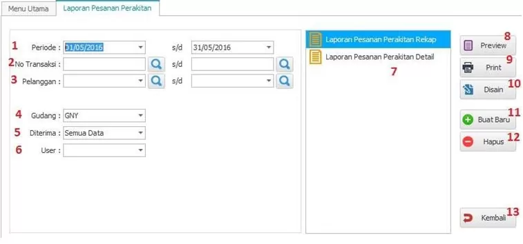 Laporan ini berfungsi untuk menampilkan / mencetak Transaksi Pesanan Perakitan yang pernah dicatat pada program dalam bentuk laporan.