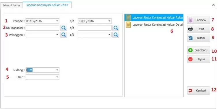 Laporan ini berfungsi untuk menampilkan / mencetak transaksi retur konsinyasi keluar yang pernah dicatat pada program dalam bentuk laporan.