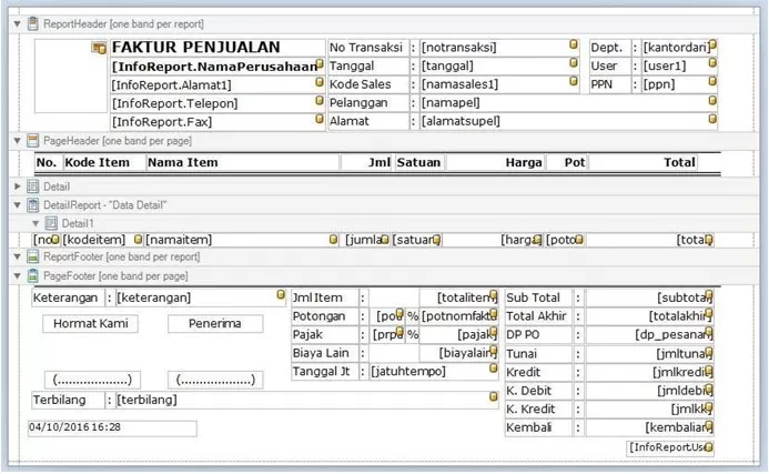 - Detail, bagian ini umumnya untuk mencetak detail / rician dari data, sifatnya berulang ulang, dapat tampil pada setiap halaman.