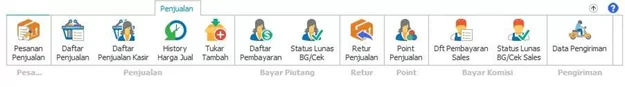 Menu Penjualan terdiri dari sub Pesanan Penjualan/SO, Daftar Penjualan, Penjualan Kasir, History Harga Jual, Daftar Pembayaran Piutang, Status Lunas CEK/BG, Retur Penjualan dan Point Penjualan.