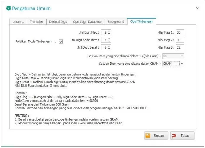 Ini adalah opsi untuk Mengaktifkan scan barcode apabila anda menjual item yang dihitung melalui beratnya, seperti buah buahan, daging dagingan dan lainnya.