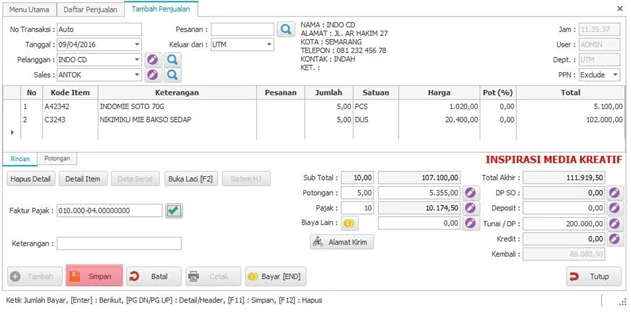 Penjualan berfungsi untuk mencatat aktivitas penjualan barang kepada Pelanggan/Konsumen, Penjualan akan secara otomatis mengurangi stok item.