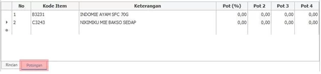 1. Cara manual : Tab potongan terletak disebelah tab rincian, setelah anda memasukkan item pada form anda dapat melakukan potongan manual pada tab ini, maupun pada potongan pada tab rincian