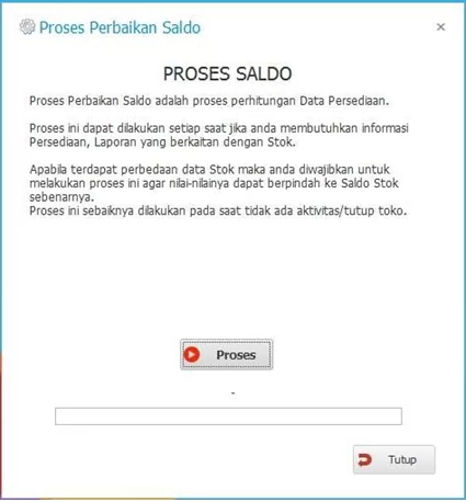 Menu ini digunakan untuk proses perhitungan data persediaan, apabila terdapat perbedaan data stok maka diwajibkan melakukan proses ini agar nilai-nilainya berpindah ke saldo stok sebenarnya. Proses Saldo dapat dilakukan kapan saja.