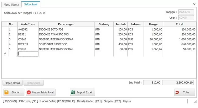 Saldo Awal Item adalah untuk menentukan/mengisi jumlah stok awal item/barang pada saat menggunakan program.
