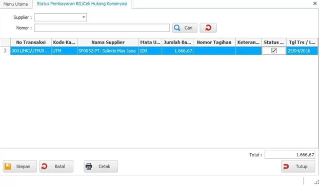 5. Akan tampil status pembayaran bg/cek Data akan tampil apabila saat pembayaran hutang memilih cara bayar cek/bg, dan status lunas tidak diberi tanda centang.