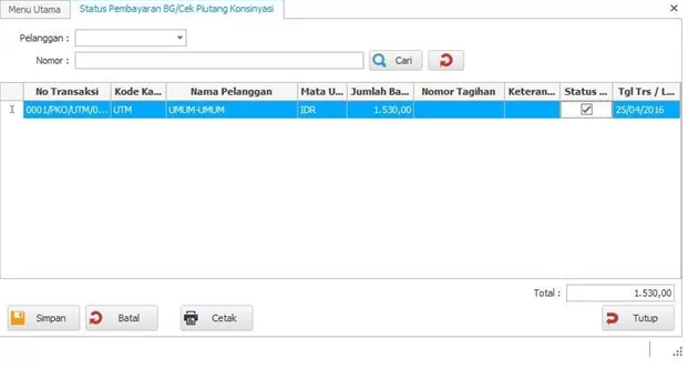 3. Pilih Pelanggan, pilih nomor cek/bg (optional),